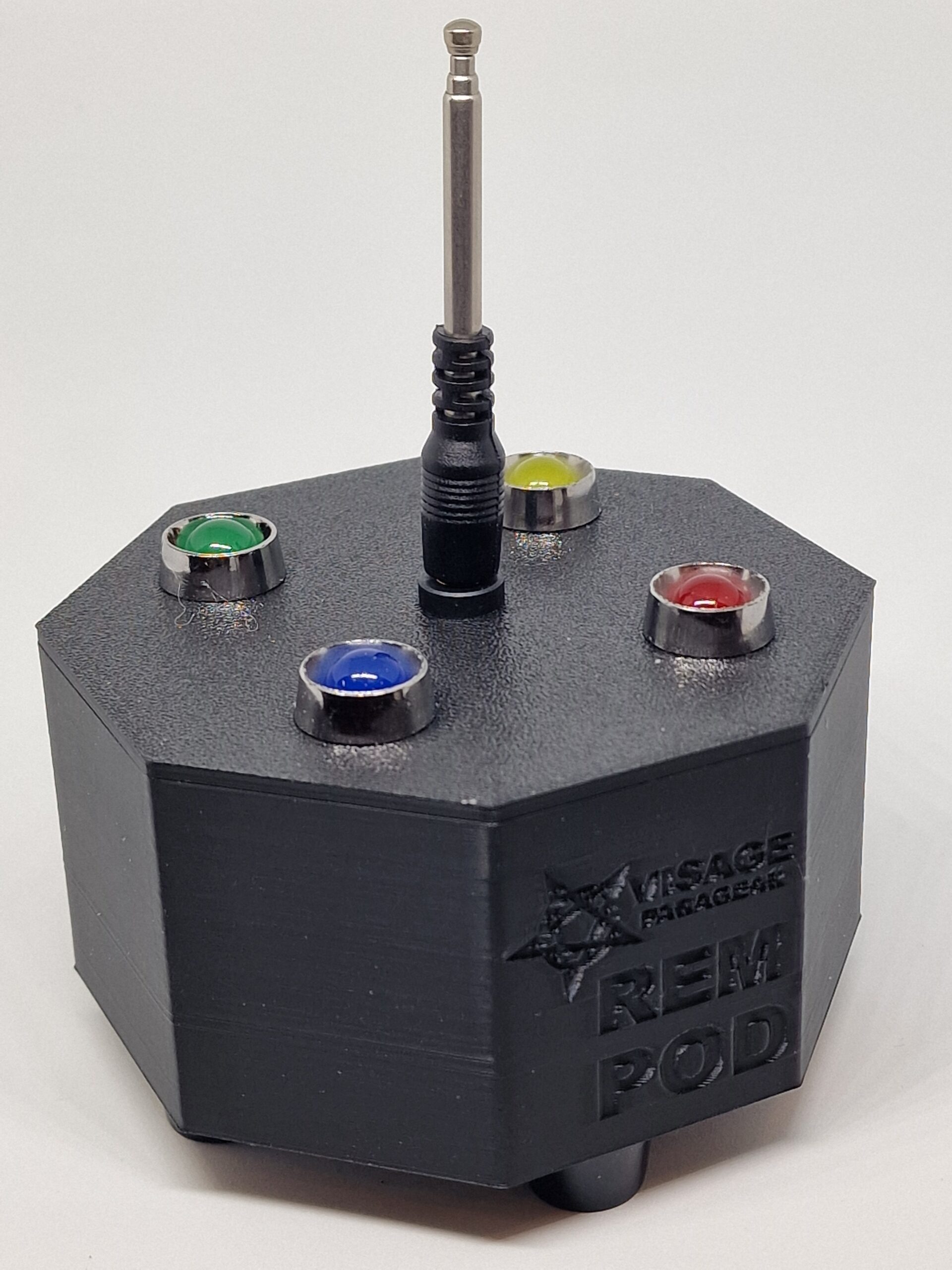 The REM Pod is a proximity detector that detects anything that goes near it. The closer it gets to the antenna the more noise it makes and the more lights flash to alert you to their presence. The light colours are Red, Blue, Green and Yellow.